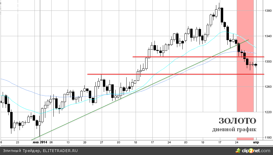 «Отметка $1300 за унцию выступала как критическая поддержка, через которую проходила линия тренда текущего года и несколько «рабочих» скользящих средних, - пишет Тайлер Ричи, аналитик 7:00’s Report. – Ближайшая поддержка проходит в районе $1275 за унцию и любые драйверы (ситуация в Украине, слабая статистика и пр.) могут дать повод для нового восходящего импульса с данного уровня цен».