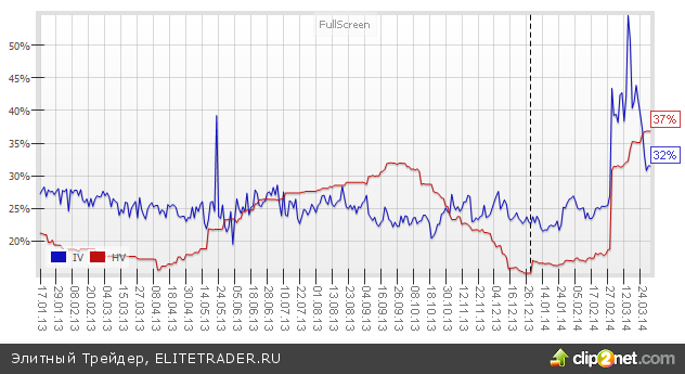 Тем временем, подразумеваемая волатильность RIM4 сейчас находится ниже исторической на 5 пунктов. Данный момент говорит о недооцененности опционов, которая может нивелироваться путем снижения рынка.