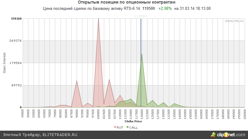 Между тем открытые опционные позиции по RIM4 со сроком исполнения 15.4.14 сейчас находятся в умеренно негативном положении. Максимальное количество открытых опционов колл расположилось уже на уровне 120000, что говорит о сильном сопротивлении на данном уровне. В свою очередь эквивалентное количество открытых опционов пут находится лишь в районе 100000.