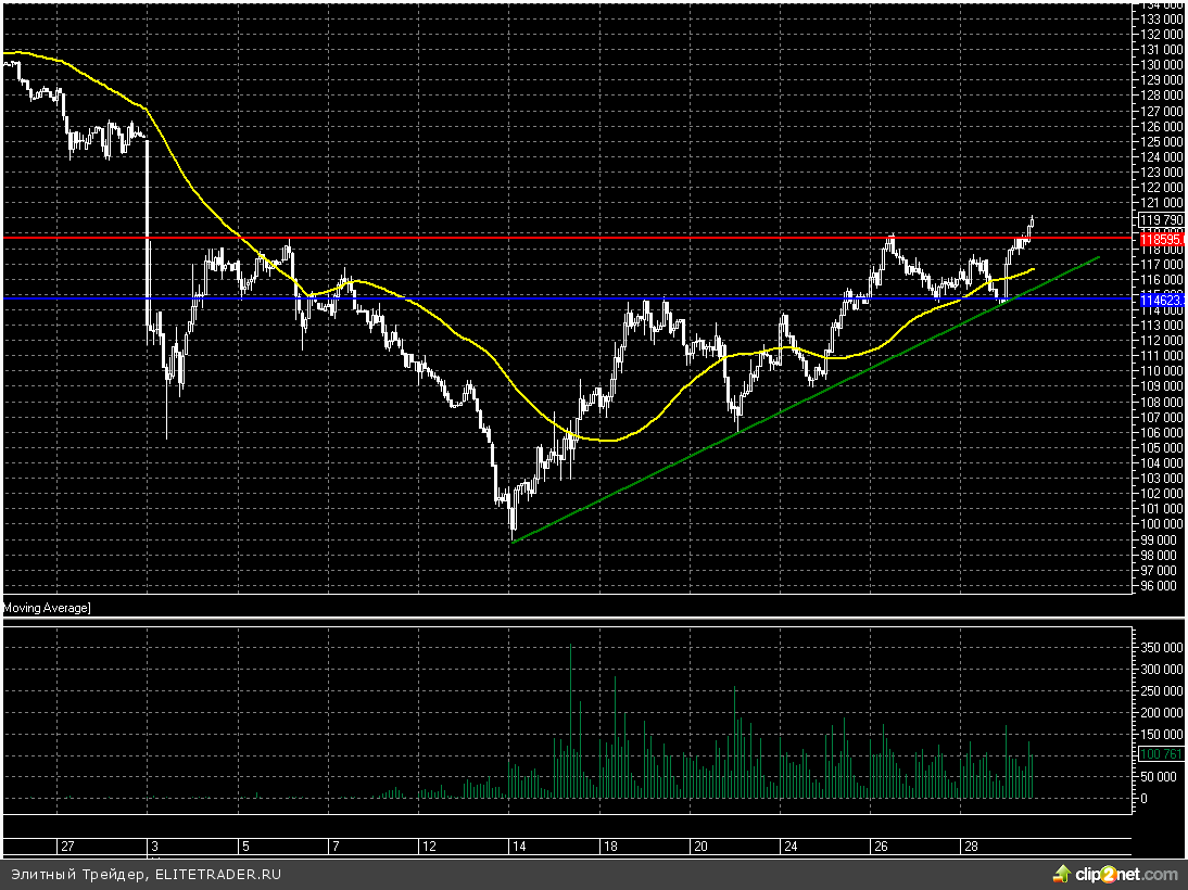 Фьючерс на индекс РТС сегодня демонстрирует впечатляющий рост. Данной динамике способствует отсутствие новых санкций для России, а также ожидание выступления главы ФРС Джанет Йеллен. Между тем в ходе текущей сессии RIM4 преодолел ключевое сопротивление на уровне 118800 и теперь вполне может продолжить растущую динамику.