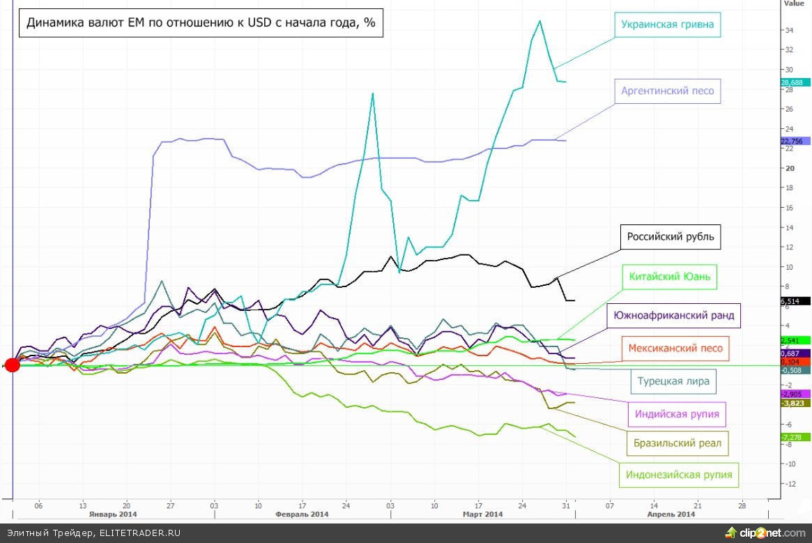 Если рассматривать валюты развивающихся стран по отношению к американскому доллару, то российский рубль потерял около 6,5%, уступив лишь гривне (-28,7%) и аргентинскому песо (-22,7%).