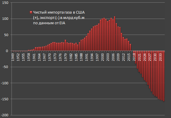 США к 2018 году планируют стать чистыми экспортерами газа в объеме 18-20 млрд куб.м и уже к 2025 году нарастить экспорт до 100 млрд куб.м, а к 2035 году вплоть до 150-160 млрд куб.м, где доля СПГ будет занимать около 80% в соответствии с обновленной информацией от EIA. Первые пробные поставки СПГ намечаются на 2016 год, более масштабное развертывание инфраструктуры не ранее 2018. Для сравнения, у России экспорт газа примерно 200 млрд куб.м, из которых в страны дальнего зарубежья 130-145 млрд куб.м.