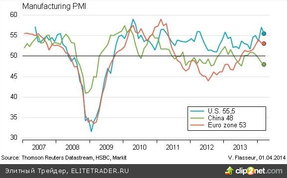 Одним из таких рисков в частности является замедление роста практически всех ведущих мировых экономик. Об этом достаточно наглядно говорит статистика по деловой активности в производственном секторе за март. Данный показатель еврозоны упал до 53, в США составил 55,5, а в Китае и в России и вовсе опустился до 48 и 48,3 соответственно.