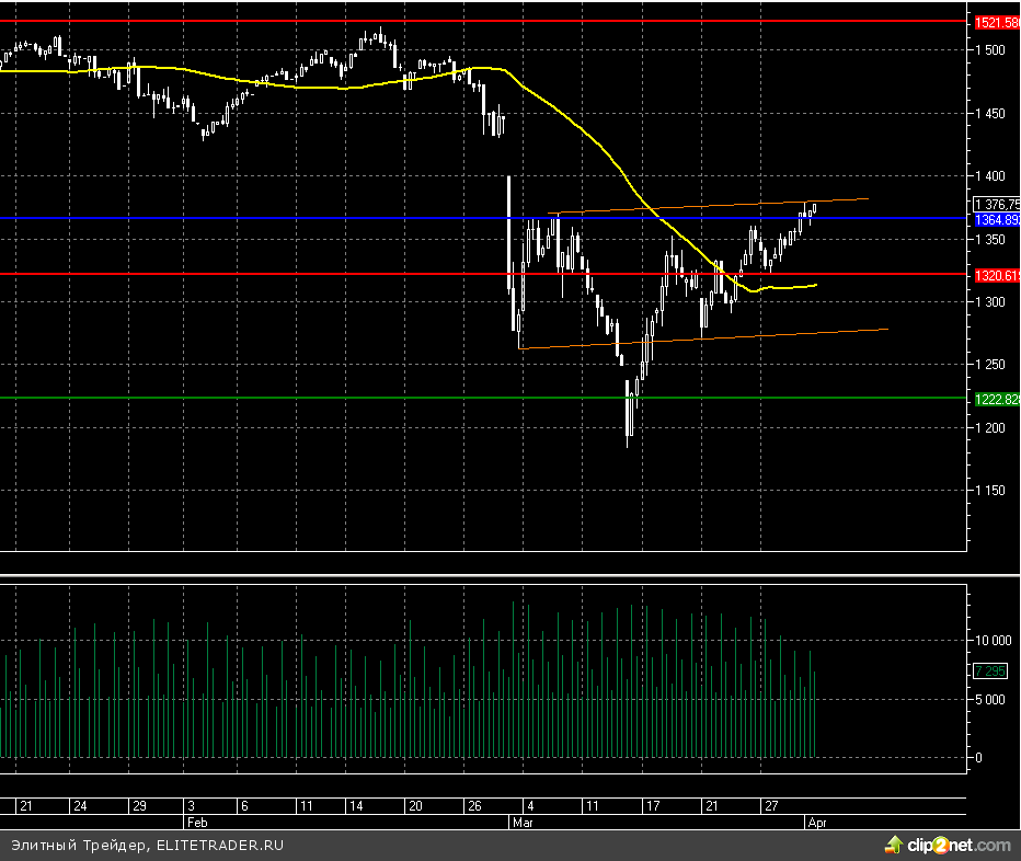 Российский рынок завершил торговую сессию вторника ростом на 0,5% по индексу ММВБ. Данный инструмент окончательно превысил свое ключевое сопротивление на уровне 1360 и похоже теперь держит путь в район 1400. Впрочем, до этой отметки достаточно сильным сопротивлением может стать еще и уровень 1380.