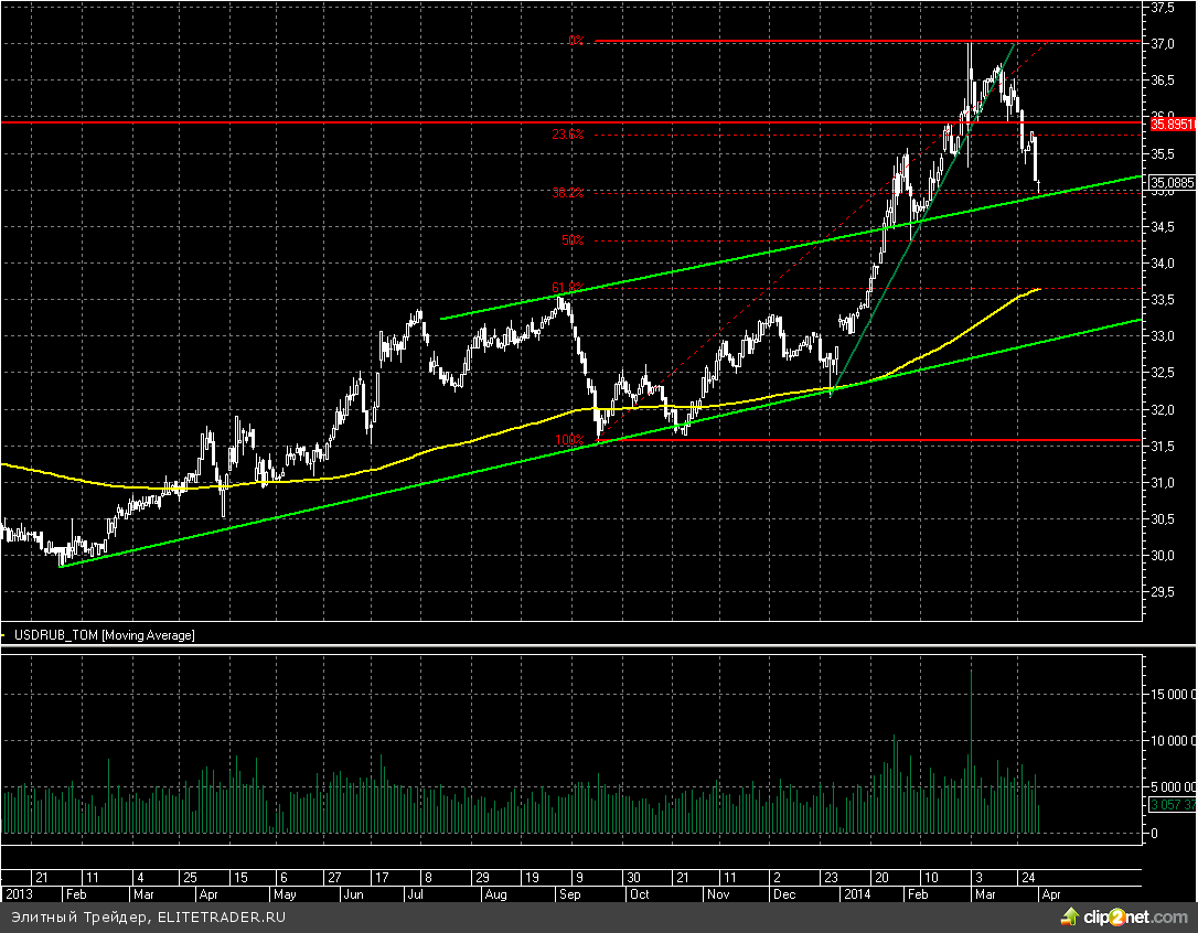 Между тем пара доллар/рубль вблизи отметки 35 смотрится крайне интересно для покупки. Здесь находится 38.2% коррекции по Фибоначчи, а также проходит верхняя линия канала.