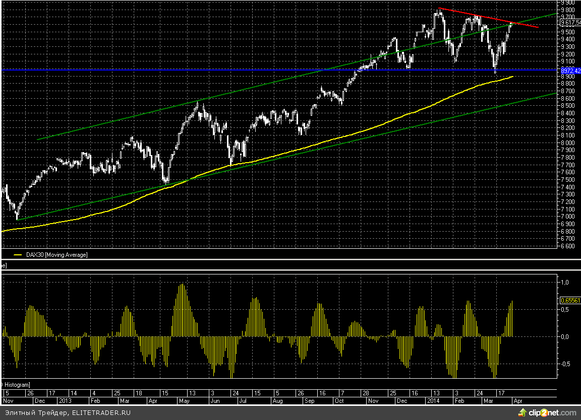 Тем временем Dax также добрался до сильного сопротивления, где проходит сразу нисходящая и восходящая трендовые линии. Поэтому здесь также вероятно начнется коррекция.