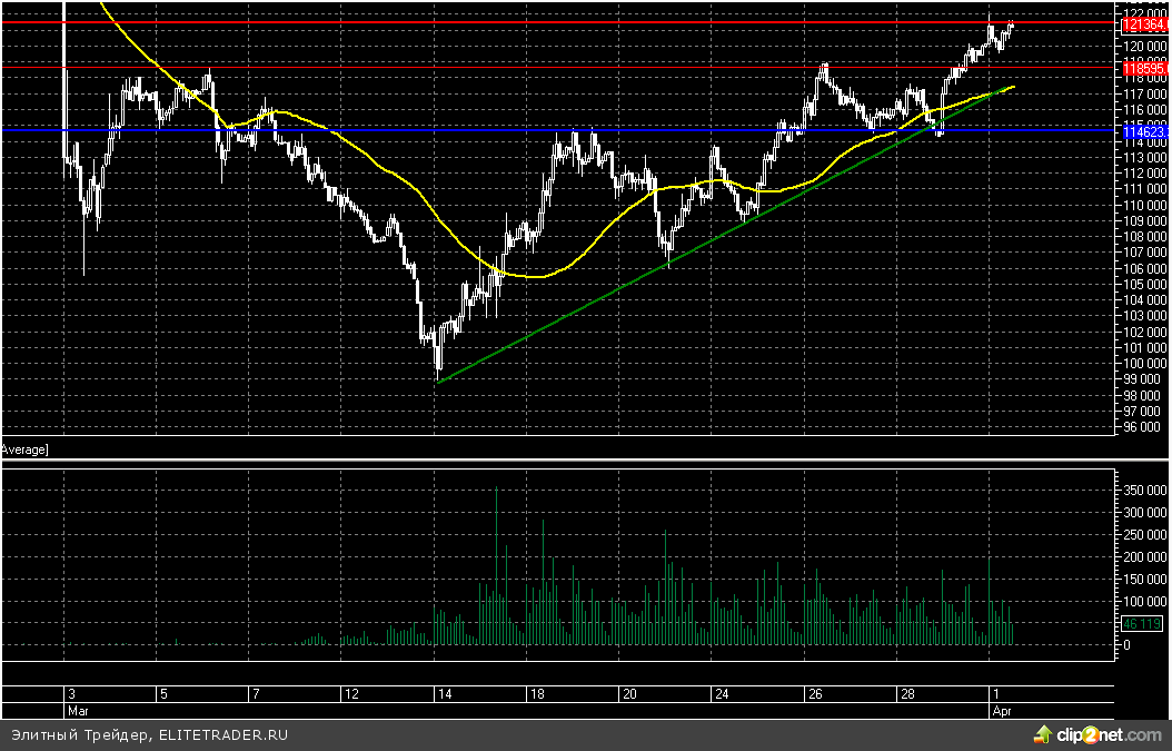 Таким образом, основные поводыри сейчас дают умеренно негативный сигнал. Поэтому в районе 121000 можно постепенно открывать короткие позиции с ближайшей целью в районе 118000.