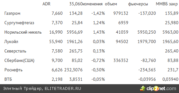 Российские ADR в Нью-Йорке 01.04 выросли (индекс Блумберга) на +0.49%. Лидировали в росте Сургутпреф (+2.07%), Русгидро (+1.83%), Норникель (+1.43%), Сургут об (+1.24%). Упали Ростелеком (-1.75%), Газпром (-1.42%) Мечел (-0.97%), Сбербанк (-0.72%), МТС (-0.69%), Вырос Market Vectors Russia ETF вырос на +0.83%