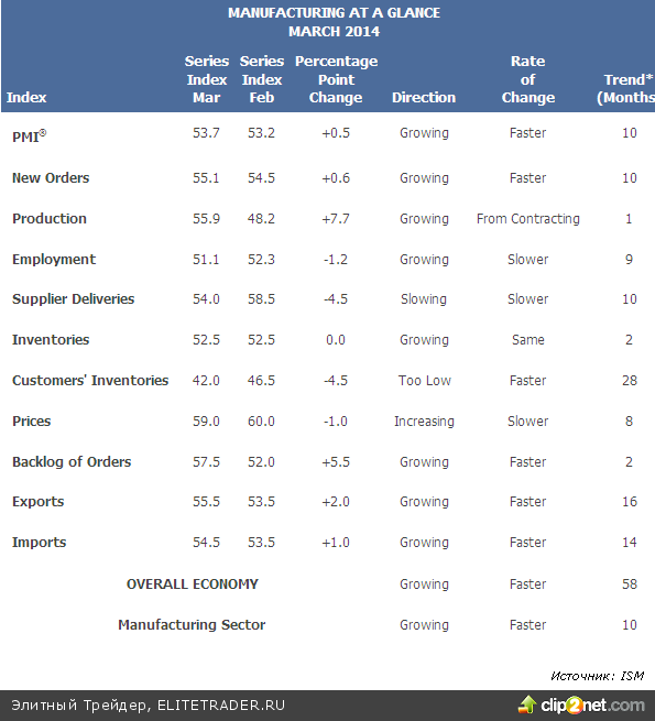 Данные по деловой активности от ISM также оказались позитивными в том плане, что PMI вырос в марте с 53,2 до 53,7 пункта, но при этом недотянул до прогнозных 54 пунктов. Таким образом, индикатор свидетельствует о росте экономической активности в производственном секторе 10-й месяц подряд. Из 18 отраслей обрабатывающей промышленности в 14 сообщали о росте в марте.