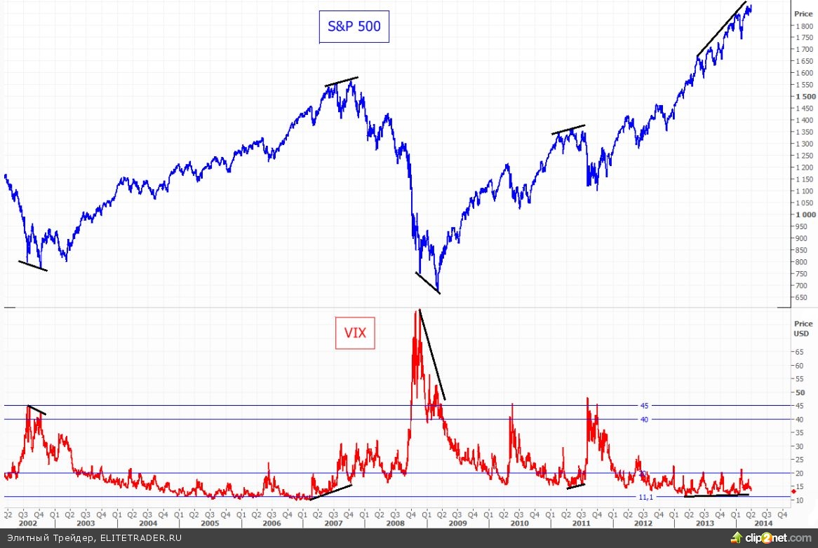 Сохраняется и долгосрочная медвежья картина в соотношении индекса и индикатора VIX. Здесь отмечается расхождение традиционной схемы, когда каждый новый максимум по SnP 500 сопровождается новым минимумом по «индексу страха». К сожалению, и этот индикатор уже длительное время сигналит вхолостую.