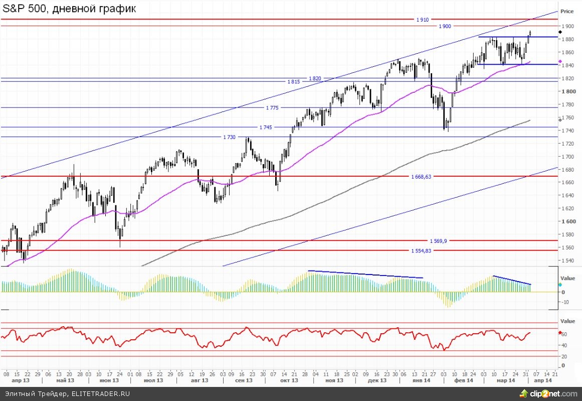 Четвертую сессию подряд закрыл ростом американский рынок согласно динамике индекса SnP500, который впервые поднялся выше 1890 пунктов, и целит сейчас на отметку 1910. Мартовское движение так и не привело к развитию коррекции, индекс смог удержаться в районе 1850, откуда и стартовала последняя волна роста.