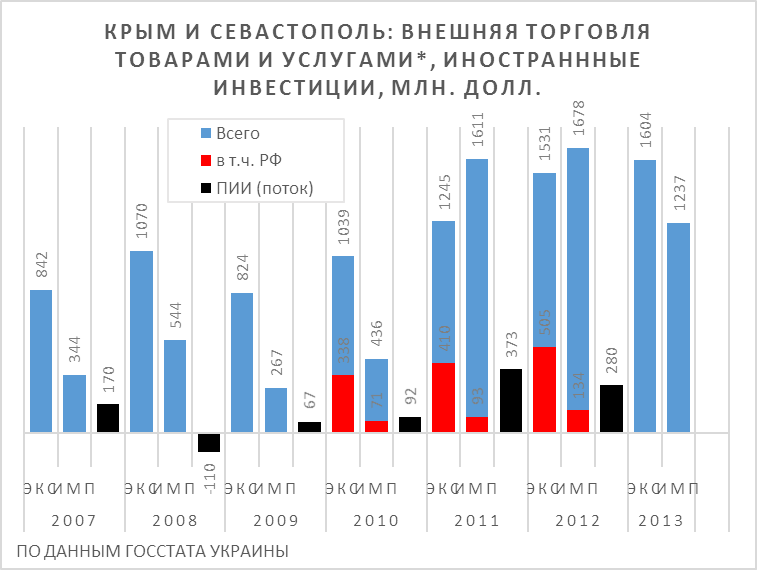 Между тем, судя по цифрам внешнеэкономической деятельности, приведенным на графике выше, Крым не выглядел такой уж «зоной брежневского застоя», даже в последние годы президентства В. Ф. Януковича, когда экономика Украины в целом «встала». Прирост ВВП Украины составил 0.3% в 2012 и 0.0% в 2013 (правда, для корректного сравнения с показателями экономики России следует учитывать, что население России с 2011 года растет, в частности, за счет миграционного притока из Украины, тогда как украинское сокращалось в среднем на 0.3% в год, естественная убыль в 2013 – 3.5 ‰, в январе 2014 – 5.2‰, так что прирост душевого ВВП до последнего времени оставался положительным, хотя и малозаметным).