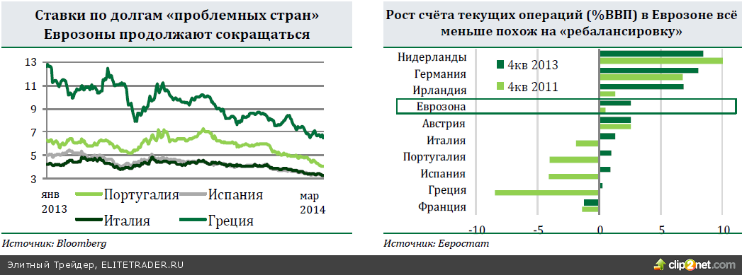 Продолжается в неспешном темпе «ралли» на рынке облигаций стран Еврозоны. Ставки по 10-летним испанским облигациям опустились с прошлогодних 5,1% до 3,3%, итальянским - с 4,9% до 3,3%, греческим - с 12,4% до 6,6%, португальским с 7,5% до 4%. Ставки по долгу Португалии (рейтинг BB) стали даже ниже австралийских 4,1% (рейтинг AAA). Хотя с поправкой на инфляцию они всё равно остаются одними из самых высоких. Учитывая медленное восстановление экономики, столь быстрое возвращение доверия инвесторов можно объяснить, на наш взгляд, лишь верой в то, что ЕЦБ использует меры количественного смягчения, если ситуация в Еврозоне снова ухудшится.