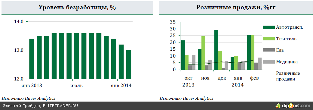 По оценкам МЭР рост ВВП в феврале составил 0,3%гг. МЭР ожидает в первом квартале рост ВВП близкий к нулю. Таким образом, стагнация в экономике России проявляется все отчетливее. Кроме того, резкий отток капитала в 1 квартале и риски его продолжения, добавившиеся к структурным проблемам экономики, не позволят надеяться на быстрый выход из стагнации. По оценкам МЭР, при годовом оттоке капитала в 100 млрд долл., экономика вырастет в 2014 г. на 0,6%гг, а падение инвестиций составит 1,3%гг. Если бегство капитала в 2014 г. достигнет 150 млрд долл., экономика уйдет в рецессию. Официальный пересмотр прогноза ведомство осуществит в апреле. Мы ожидаем активный пересмотр прогнозов на 2014-15 гг. всеми ведомствами и экспертами из-за резкого изменения ключевых параметров прогнозирования в первом квартале этого года. Мы ожидаем снижения консенсус-мнения на 2пп относительно конца 2013 года.