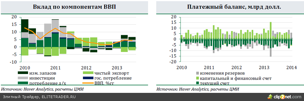 Необходимым условием высого роста может стать только стабильность притока капитала. Высокий уровень дефицита счета текущих операций (около 8% ВВП в 2013 году) требует финансирования. Если приток капитала сократится, то в текущем году рост может замедлиться до 3%гг. Политическая стабильность - ключ к устойчивости притока капитала. Показателем этой стабильности должны стать как местные, так и президентские выборы. Если Эрдогану и правящей Партии справедливости и развития удастся удержать свои позиции, то внутриполитическая обстановка останется благоприятной и более предсказуемой. Тогда во второй половине года можно будет ожидать притока капитала, который придаст дополнительный стимул экономическому росту. Опережающие индикаторы, такие как уровень доверия населения и бизнеса, а также индекс деловой активности промышленност PMI, пока свидетельствуют об устойчивости роста экономики.