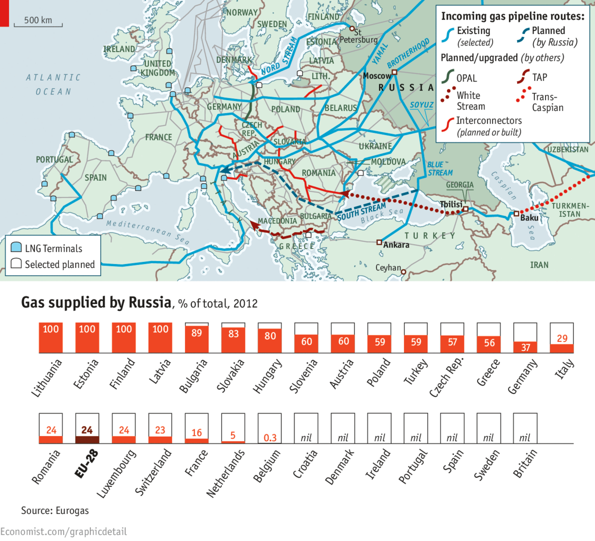 Кризис на Украине встревожил всю Европу и не только из-за перспективы войны или хаоса на границах, а из-за долгов Украины перед Россией за газ, которые угрожают энергетической безопасности остальной части континента. Европа сможет пережить короткое прерывание длиною в несколько недель в поставках через Украину, при условии, что по другим трубопроводам газ продолжает идти. ЕС стал более устойчив в этом плане после проблем 2009 года. Теперь он спешит и далее сокращать свою зависимость. Такие меры, как более качественное хранение, большее количество трубопроводных перемычек и диверсификация поставок займет ещё несколько лет. В долгосрочной перспективе Европа может закупать больше газа по новым направлениям, главным образом, из США. ЕС также может воспользоваться мощностью норвежских ГЭС. В данный момент, Европа не сможет обойтись без русского газа, но и с другой стороны, Кремль не сможет обойтись без европейских покупателей.