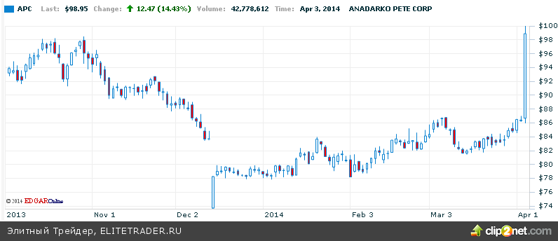 Лидером в составе SnP500 вчера были акции нефтедобытчика Anadarko Petroleum подорожавшие на 14,51% на сообщениях о решении суда по выплате компанией $5,15 млрд. штрафа за загрязнение окружающей среды. Многочисленные иски к компании могли вылиться в куда большие штрафные последствия для нефтедобытчика.