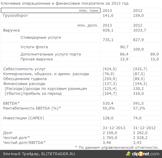 НМТП отчитался за 2013г.. Текущий год принес снижение грузооборота, выручки и EBITDA компании. Грузооборот снизился на 11.3%, выручка на 10.2%, EBITDA упал на 13.7%. В плане чистого убытка дополнительную неприятность НМТП принесло обесценение гудвилл и потери по валютным разницам из-за долларового кредита Сбербанка на балансе. Произошло списания из-за обесценения активов на$259,9 млн — Приморского торгового порта (ПТП) и «Союзфлотпорта», сервисной компании в этом порту.
