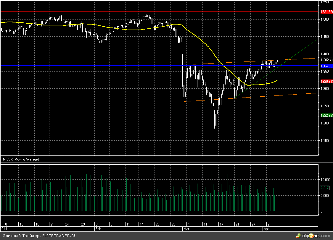 Российский рынок завершил торговую сессию пятницы существенным ростом. ММВБ прибавил более 1%, но существенно выше 1380 закрыться так и не смог. Поэтому есть вероятность, что уже в понедельники «медведи» снова попробуют перехватить инициативу.