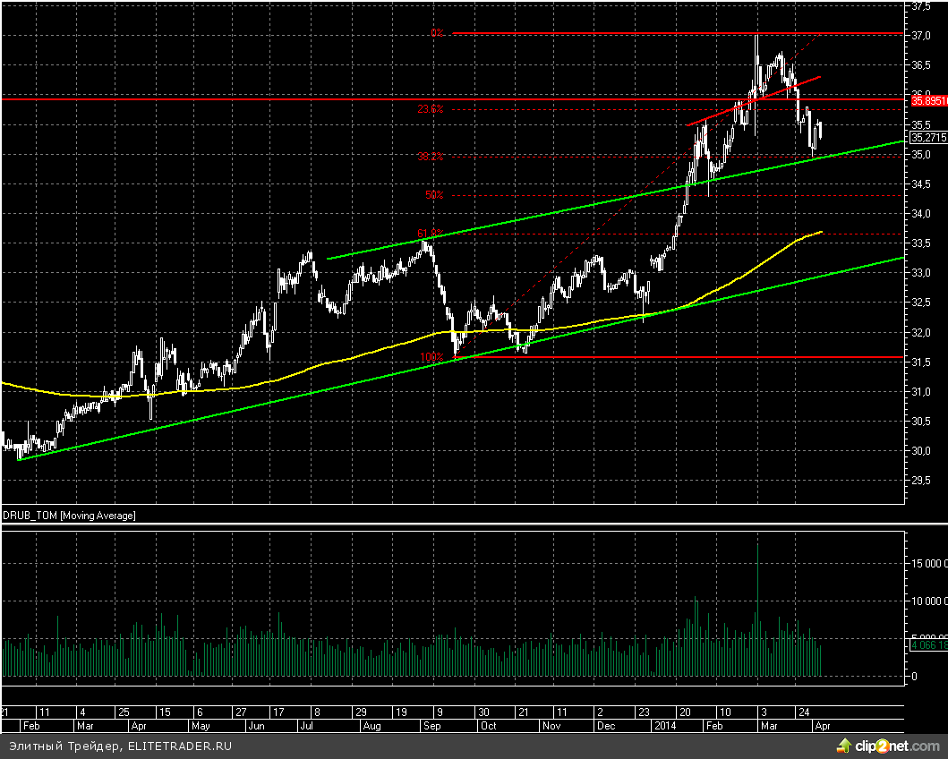 Между тем пара доллар/рубль вблизи отметки 35 смотрится крайне интересно для покупки. Здесь находится 38.2% коррекции по Фибоначчи, а также проходит верхняя линия канала.