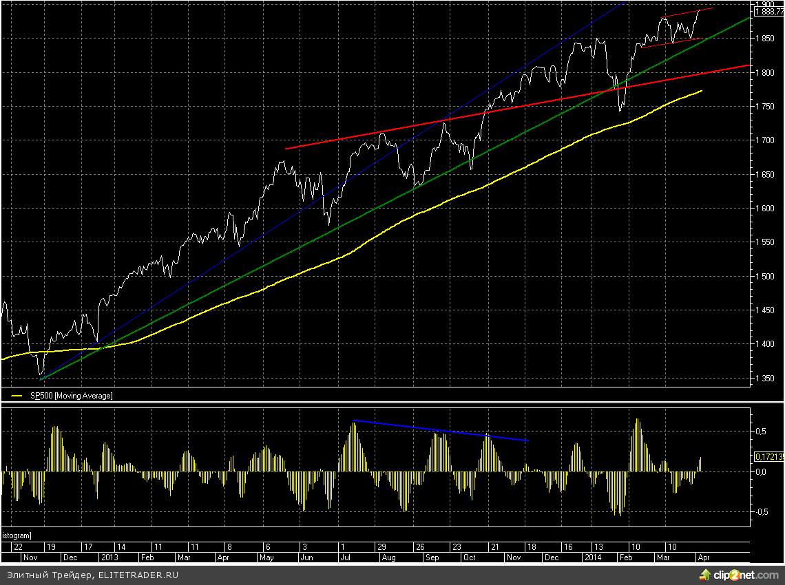 Индекс SnP500 уже больше 1 месяца торгуется в диапазоне между отметками 1850 и 1890. Сейчас данный инструмент подходит к верхней части этого диапазона и может начать от него корректироваться, особенно учитывая наличие нескольких дивергенций между ценой и MACD гистограммой.