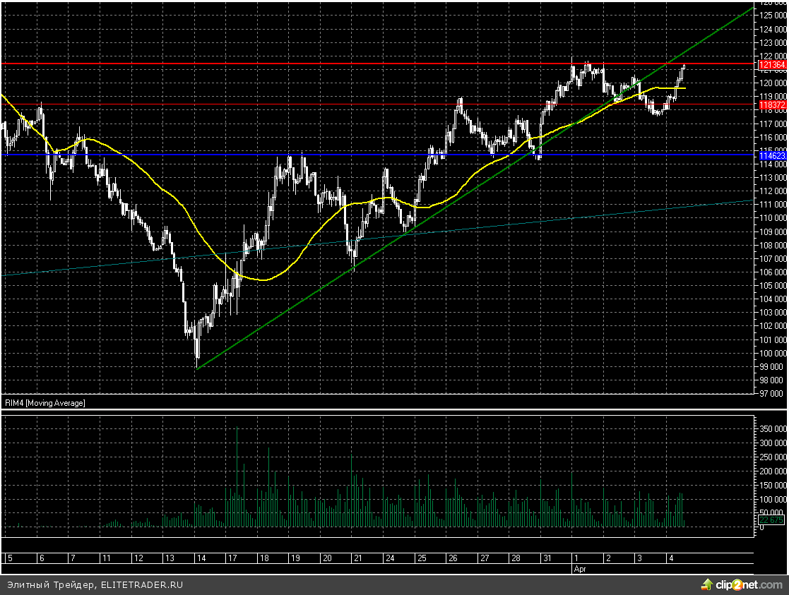 Таким образом, основные поводыри сейчас дают умеренно сигнал на продажу. Поэтому можно попробовать начать продавать RIM4 вблизи уровня 121500 с коротким стопом.
