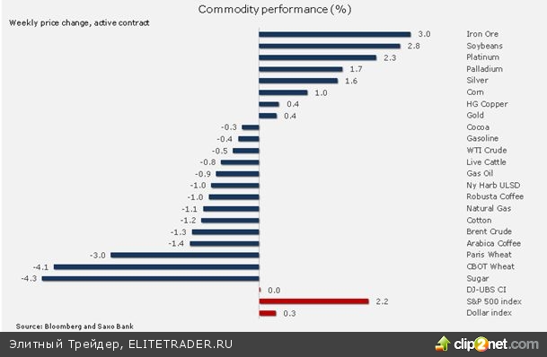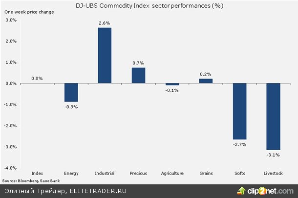 Зерновой сектор получил толчок к росту благодаря двум отчетам правительства США, которые свидетельствовали о том, что этим летом запасы соевых бобов и урожай кукурузы уменьшатся, так как фермеры отдали предпочтение другим сельскохозяйственным культурам. Наилучшие результаты показали промышленные и драгоценные металлы. Цены на алюминий выросли под влиянием сокращения объемов добычи, в то время как цена на медь удержалась выше ключевого уровня поддержки на фоне надежд на стимулы в Китае. Золото восстановилось после публикации отчета о занятости в США, который успокоил нервы некоторых участников рынка. В целом широкий сырьевой индекс DJ-UBS завершил неделю без существенных изменений: рост в секторе металлов был сбалансирован потерями в энергетическом секторе и секторе выращиваемых товаров.