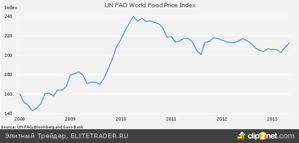 Мировые цены на продукты питания в марте достигли максимального значения за десять месяцев. Засуха, погубившая урожай в различных уголках мира, холодная зима в США и напряженная геополитическая обстановка в черноморском регионе — все это способствовало повышению стоимости многих продуктов от говядины до пшеницы. Мировой индекс цен на продукты питания, составляемый Продовольственной и сельскохозяйственной организацией ООН и отслеживающий динамику цен 55 продовольственных элементов, вырос на 2,3% и достиг максимального значения с мая прошлого года. Сейчас индекс равен 212,8, колеблясь в промежутке между 200 и 220 после установления максимума на отметке 240 в 2010 году. Тогда вопрос продовольственной безопасности стоял очень остро в связи с резким скачком цен на ключевые продукты питания, что косвенно привело к «арабской весне» в декабре того же года.