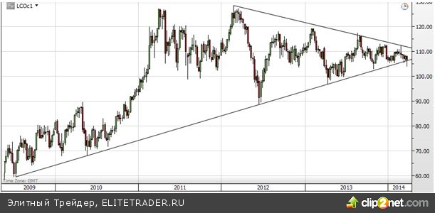 До коррекции контракт на нефть сорта Brent пробил восходящий тренд, действующий с 2009 года, и встретил поддержку на уровне 104 доллара за баррель (минимум с ноября). На данном этапе возможности для краткосрочного роста ограничены, так как уровень запасов достаточно высокий, и предложение может увеличиться еще больше, если Ливия возобновит экспорт нефти. Американский спрос на импортную сырую нефть опустился до самого низкого уровня с 1996 года благодаря подъему внутренней добычи. Это способствовало дальнейшему уменьшению ценовой разницы между двумя международными сортами нефти — Brent и WTI. На этой неделе она составила почти 5 долларов за баррель, что равно минимальному с октября значению.