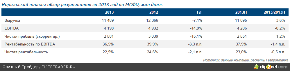 Выручка в 2013 году упала на 7% г/г до 11 489 млн долл. (оказавшись при этом на 3,6% выше наших ожиданий) в основном по причине снижения цен и объемов продаж. Однако стоит отметить, что в 2012 и 2013 годах группа провела реклассификацию побочных металлов – родия, серебра и кобальта – ранее компания уменьшала консолидированные затраты на сумму выручки от их реализации, тогда как после реклассификации она относит их на выручку от продажи металлов. Другими словами, ранее эти металлы учитывались как побочная продукция, а сейчас как «другие металлы». С учетом данной корректировки выручка компании лишь незначительно превысила наши ожидания. Реальное расхождение между фактическими и прогнозными показателями обусловлено главным образом большим объемом продаж никеля и более высокой ценой реализации меди по сравнению с ожиданиями.