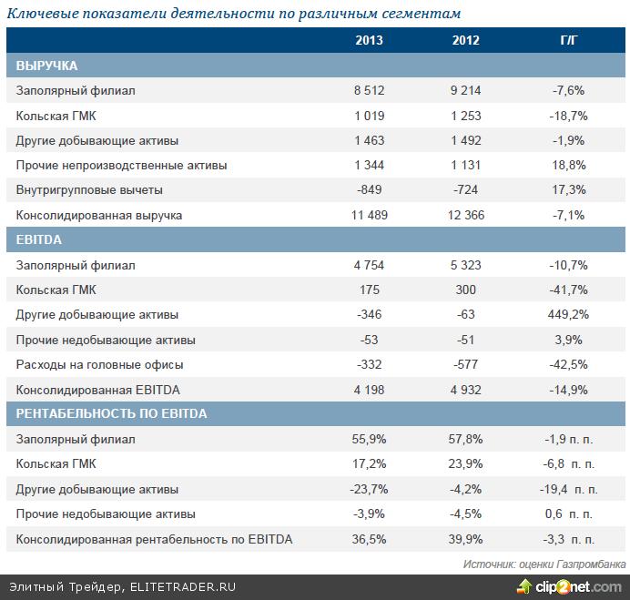 Норильский никель представил новую отчетность по подразделениям (данные приведены в таблице ниже), отражающую впечатляющие результаты деятельности Заполярного филиала (рентабельность по EBITDA на уровне 55,9%, незначительное снижение лишь на 1,9 п.п. г/г) и слабые итоги производственных активов вне Заполярного и Кольского подразделений (рентабельность по EBITDA на уровне -23,7%, -19.4 п. п. г/г). Рентабельность по EBITDA Кольской ГМК составила 17,2% в 2013 г., что нельзя считать слабым показателем. Отметим, что к другим производственным активам относятся подразделения по переработке, реализации, а также разведке как в России, так и за рубежом (как мы понимаем, в основном последние).