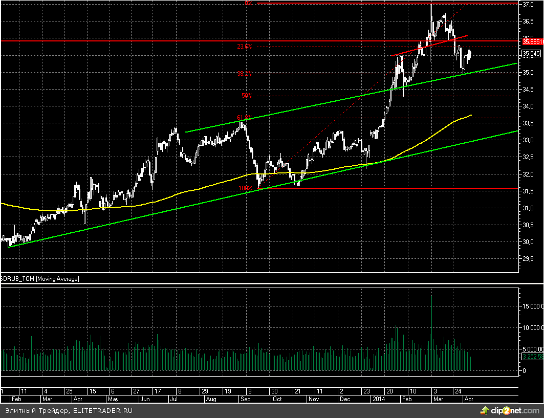 Российская валюта по отношению к доллару накануне благополучно добралась до основной цели снижения на отметке 35,8. Теперь некоторое время данная валютная пара вполне может торговаться в боковом диапазоне или даже немного скорректироваться. Впрочем, основным драйвером для движений рубля сейчас остается ситуация на Украине и если здесь обстановка будет ухудшаться, то новая волна ослабления российской валюты не заставит себя долго ждать. При этом еще одним катализатором движений в ближайшее время будет выступать публикация проколов ФРС, которая произойдет уже завтра. Сейчас участники концентрируют свое внимание на сроках, когда в стране начнут постепенно повышать ставки. На данный момент ожидается постепенный подъем с апреля 2015 года и любой намек на более ранние действия может оказать определенную поддержку американской валюте. Поэтому спешить открывать новые позиции сейчас не стоит и лучше некоторое время побыть в стороне до появления большей ясности.