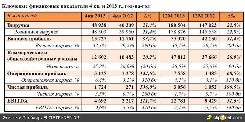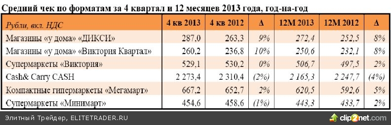 Наибольший вклад в рост выручки Компании в 2013 году внес дивизион «ДИКСИ», показав рост на 42,2% год-на-год до 137 183 млн. руб. Выручка Дивизион «Мегамарт» в 2013 году выросла на 14,7% год-на-год до 15 798 млн. руб. В 2013 году наибольший рост среднего чека, на 8% показали магазины «у дома» «ДИКСИ» - до 272,4 руб. и магазины «у дома» «Виктория Квартал» - до 250,6 руб.