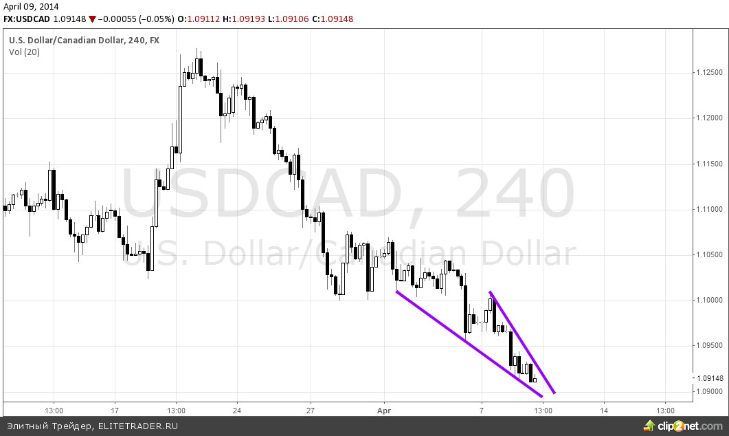 Ближе к вечеру были представлены канадские данные по количеству выданных разрешений на строительство новых домов. Они оказались хуже консенсус-прогнозов аналитиков. Они сделали предположение о снижении количества выданных разрешений на 2.4%, но представленное значение показало падение на 11.6%. Но не смотря на эти данные, канадский доллар продолжил развивать тренд на укрепление и пара USD/CAD снижается. Сейчас торги проходят с образованием паттерна “Клин”.