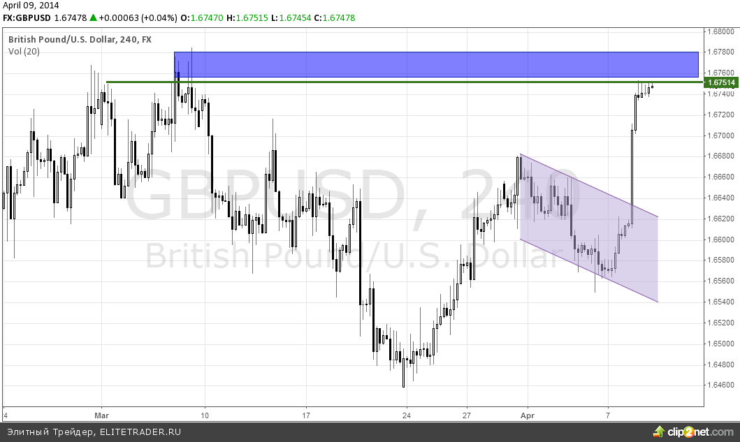 Вчера днем были представлены неожиданно позитивные отчеты по изменению объема производства в обрабатывающей промышленности Великобритании. Ранее опрошенные аналитики представили расчеты об увеличении темпов роста производства на 0.3%, но реальное значение составило 1.0%, что привело к росту спроса на британский фунт. Стоит отметить, что участники заседания Банка Англии при принятии решения об изменении или сохранении дальнейшего курса денежно-кредитной политики, обращают внимание на отчеты по промышленному производству. Валютная пара GBP/USD в ходе вчерашней торговой сессии укреплялась более чем на 130 пунктов, чему способствовал выход из параллельного канала, и сейчас проводит торги вблизи 1.6750. Дальнейшее восходящее движение встретит на своем пути область сопротивления 1.6750 – 1.6800, где расположены уровни экстремумов. Поддержкой при снижении послужит отметка 1.6700.
