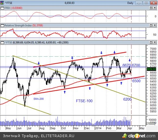 Были опубликованы данные баланса внешней торговли Великобритании, которые оказались умеренно-позитивными. Дефицит торгового баланса сократился. С августа прошлого года индекс движется в восходящем канале с нижней границей на сегодня 6500. За это время мы видели пять попыток биржевых медведей подавить 200-х дневную скользящую среднюю (простую) и все они были неудачными. Нужна серия плохих статистических данных, чтобы пробить вниз нижнюю границу канала. Но на этой неделе индекс доверия инвесторов к экономике еврозоны (Sentix) просигнализировал о росте доверия.