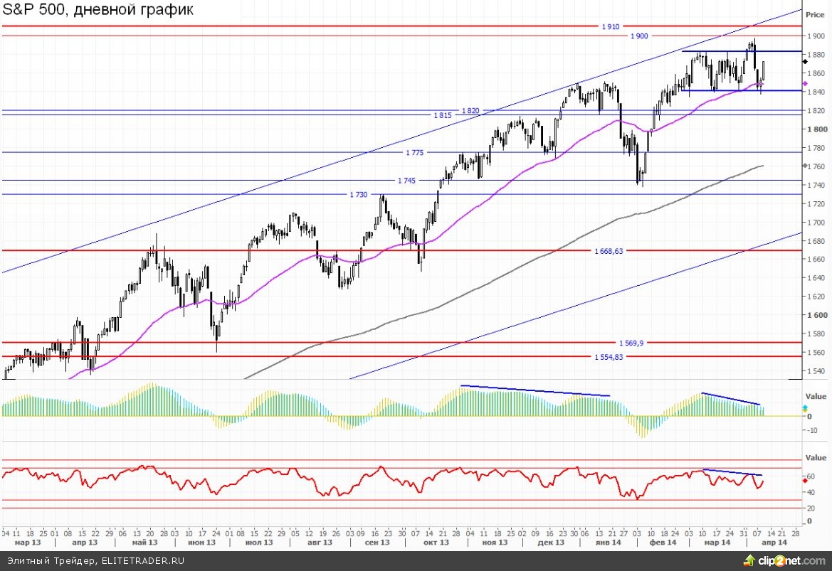В итоге резюмируем: Пока цена выше 1840 и 1820 сохраняется потенциал роста вплоть до 1905-1910. Если же индекс опустится ниже 1820, то начнется большая коррекция с ориентирами в районе нижней границы долгосрочного восходящего тренда.