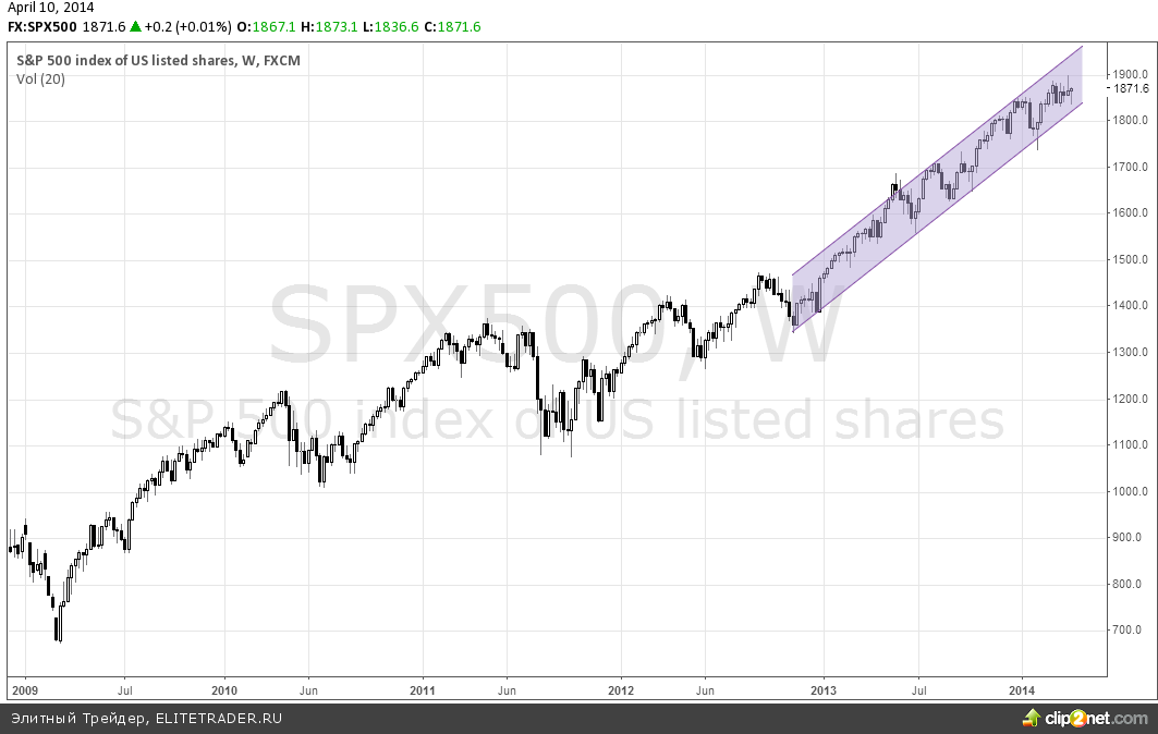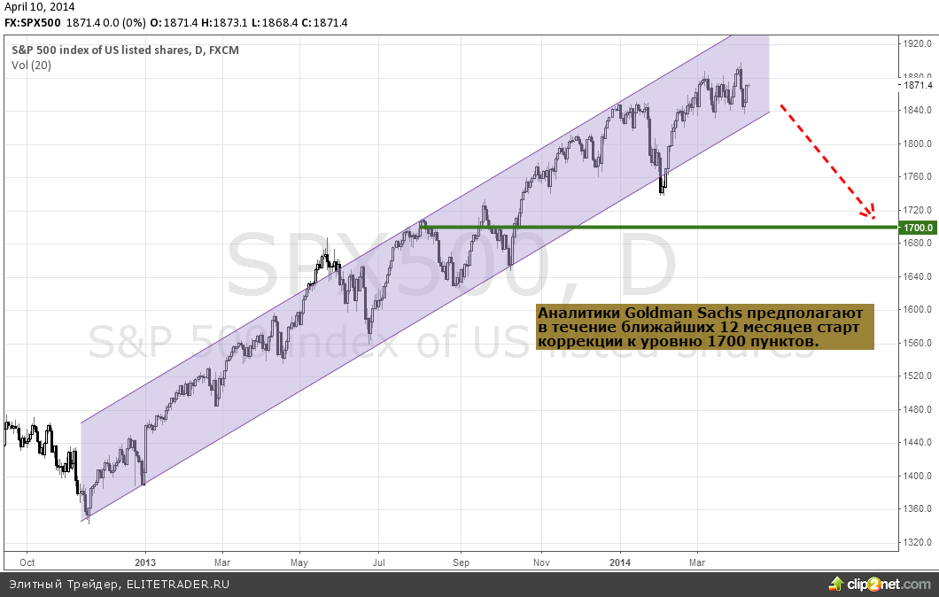 Аналитики подразделения, специализирующегося на торговле акциями, инвестиционного банка Goldman Sachs предположили, что долгосрочной перспективе 12 месяцев индекс широкого рынка SnP 500 может начать корректироваться после приблизительно 22-месячного периода роста. С начала 2013 года на многих торговых сессиях происходит обновление исторических максимумов, и самый последний экстремум был обновлен в марте 2014 года на уровне 1900. Ниже наглядно продемонстрирован рост графика индекса с 2009 года.