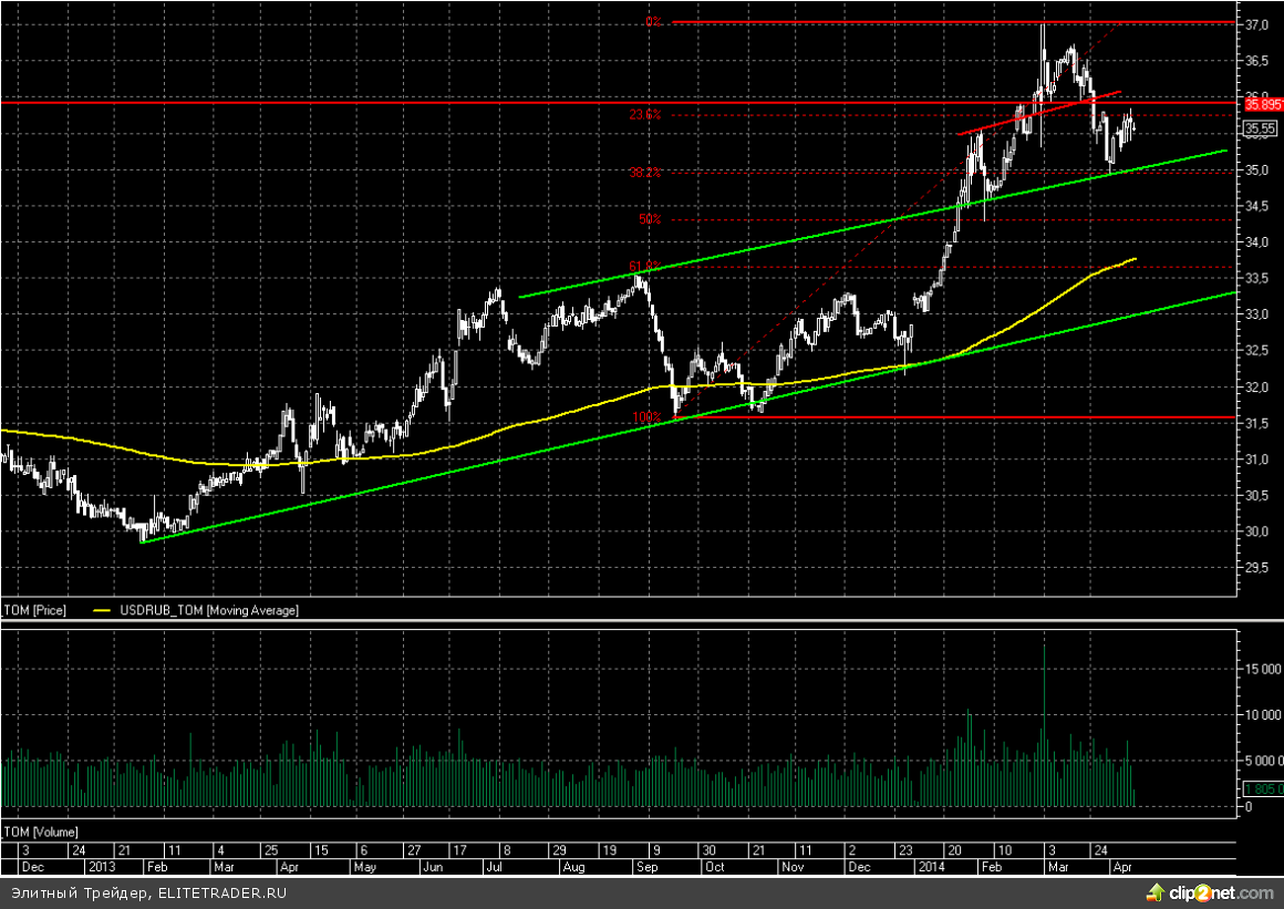 Между тем дополнительным позитивом для рубля сейчас являются высокие цены на нефть, которые продолжают свой постепенный рост на фоне хорошей статистики из Китая. Торговый баланс Поднебесной в марте неожиданно вырос на 7,7 млрд юаней при средних ожиданиях снижения на 0,9 млрд. Также поддержку рублю оказывают интервенции ЦБ. На это фоне российская валюта сегодня укрепилась до отметки 35,5. Впрочем, торговля сейчас ведется в диапазоне, и рассчитывать на новое трендовое движения можно лишь после выход из него. Ключевое сопротивление данной пары располагается на отметке 35,8, а поддержка в районе 35,3. Многое здесь по-прежнему будет зависеть от ситуации на Украине и возможных санкций для России. Если ситуация в этом направлении начнет улучшаться, то рубль может очень неплохо укрепиться.