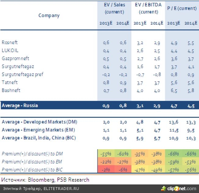 Российские ВИНК в большинстве своем выглядят дешевыми и по сравнительным коэффициентам. В целом, российские компании недооценены на 38% по показателю EV/EBITDA 2014 по отношению к аналогам с развитых и развивающихся стран. По показателю P/E 2014 они недооценены более, чем на 50%.