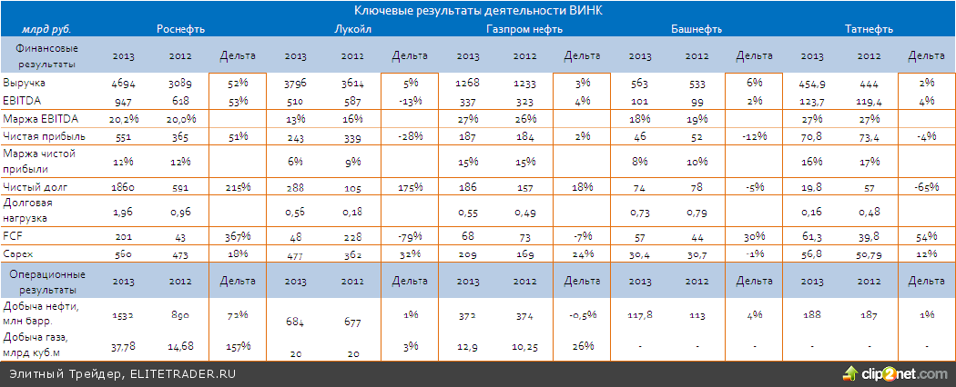 Судя по последним операционным и финансовым результатам, российские ВИНК в целом чувствуют себя стабильно и, несмотря на давление государства в части сбора налогов, продолжают наращивать добычу. В то же время в 2013 г. предпочтение отдавалось сделкам M&A, а не органическому росту. С точки зрения финансовых показателей сектор также достаточно стабилен, ВИНК показывают достаточно высокую маржу и относительно низкий уровень долговой нагрузки.
