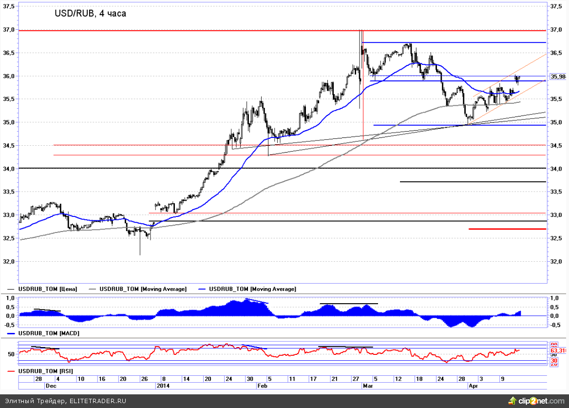 На валютном рынке вчера наблюдалось серьезное ослабление российского рубля. С самого открытия котировки пары USD/RUB подошли к важному рубежу сопротивления около 36. В случае уверенного преодоления этого района откроется дорога для дальнейшего ослаблению рубля с возможным ретестом мартовских максимумов. Кроме того также напомню, что вчера на валютный рынок планировал выйти с покупками Минфин. Интервенции ЦБ в связи с этим должны были быть уменьшены примерно на $100 млн.