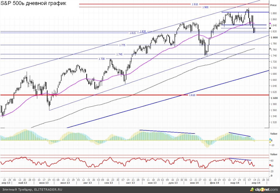 Напомню, что в прошлую пятницу наш рынок чувствовал себя достаточно уверенно и игнорировал солидное падение за океаном, а уже вчера, когда американские индексы восстанавливались в унисон с ростом напряженностью в Украине, нас продавали (на вечерней сессии фьючерсы на РТС и ММВБ потеряли около 0,7%). Это еще раз подтверждает силу украинского фактора. На мой взгляд, высока вероятность, что в самой ближайшей перспективе инициатива на нашем рынке пока еще будет оставаться на стороне продавцов.