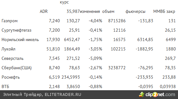 ADR в США 14.04.14 (Северсталь, Роснефть, ВТБ в Лондоне ) и закрытие вечерних фьючерсов в России. Цветами (или знаками +-) далее изображен характер разницы по сравнению с закрытием вечерних фьючерсов ночью накануне. Евро/доллар ))1.3816 в 8.00 вторника))1.3853 в 7.56 понедельника))1.3895 в 8.04 пятницы )