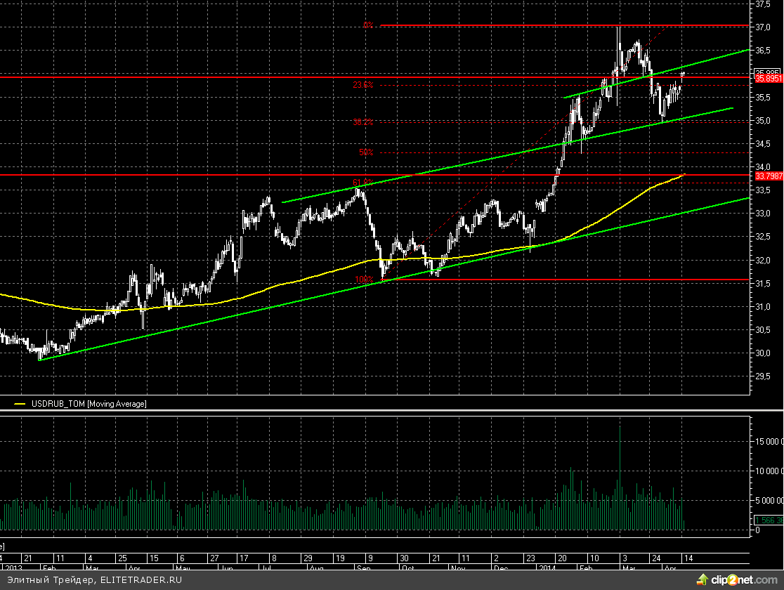 Дополнительным негативом для российского рубля является сегодняшняя статистика из Китая. Рост денежной массы в Поднебесной в марте замедлился до 13-летнего минимума и составил 12,1%. На этом фоне пара доллар/рубль уже закрепилась выше 36, но, т.к. здесь располагается серьезное сопротивления, в дальнейшем пара может приостановить рост или даже немного скорректироваться. Сейчас есть целый ряд факторов, которые сдерживают падение рубля и в дальнейшем могут спровоцировать даже его рост. В частности спрос на национальную валюту увеличился благодаря налоговому периоду в стране, а ЦБ в свою очередь оказывает давление на доллар, проводя ежедневные интервенции. Между тем цены на нефть также поддерживают рубль, торгуясь уже выше 108,5 долларов за баррель по сорту Brent.