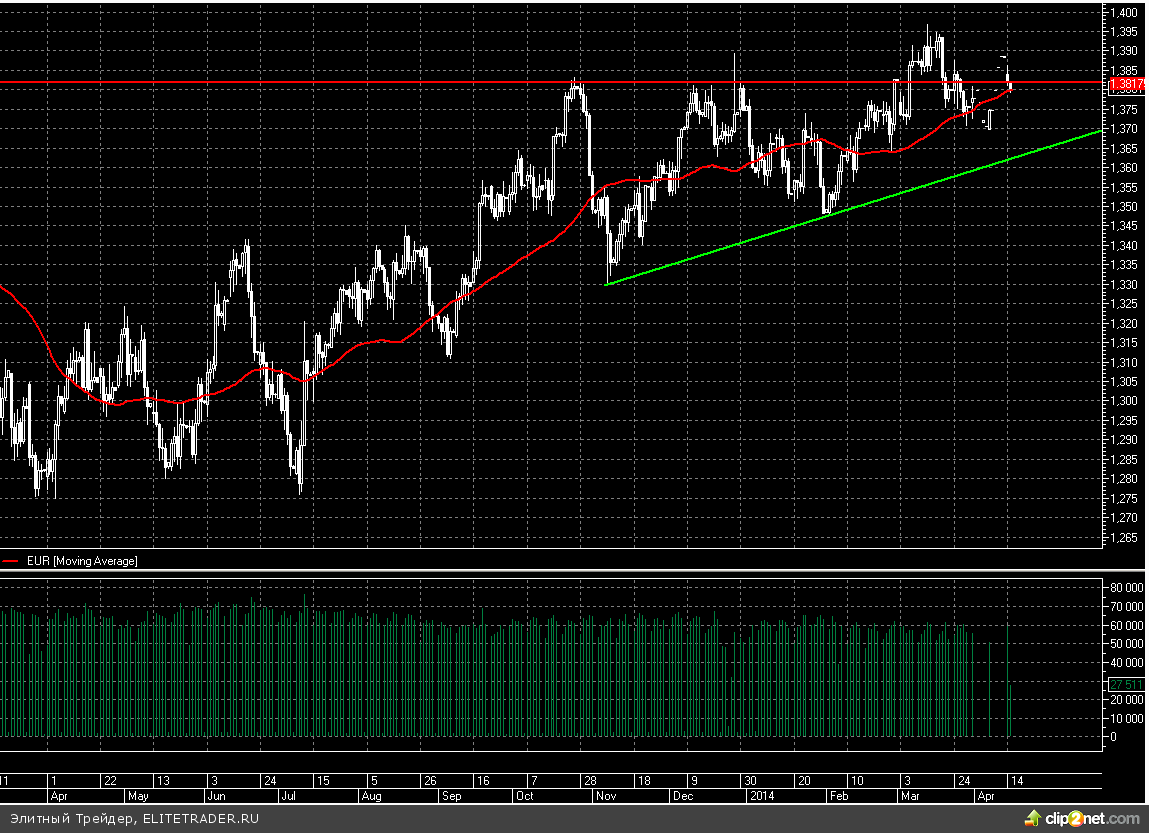 Тем временем евро продолжает постепенно снижаться к американскому доллару и уже добрался до сильной поддержки на отметке 1,375.Здесь проходит 50-дневная скользящая средняя, которая может на время приостановить данное снижение. Впрочем, статистика по региону выходит в последнее время достаточно слабой, а возможность дополнительного стимулирования продолжит оказывать давление на валюту. Поэтому в ближайшем будущем мы вполне можем увидеть возвращение данной валютной пары в район 1,37.