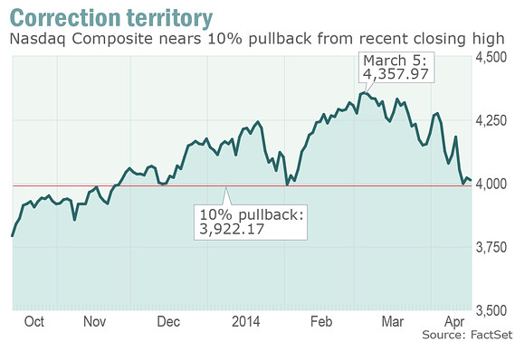 На фоне побоища, в котором участвовали такие известные модные названия как Pandora и Tesla, основным индексам ещё предстоит закончить снижение в размере 10% от максимумов. Движение ниже будет означать коррекцию. Индекс Nasdaq Composite, тем не менее, приближается к этому. Как показывает график, понадобится снизиться до 3,922.17, чтобы обозначить 10% падение с максимума 5 марта на уровне 4,357.97 (10% снижение от внутридневного максимума 6 марта в 4,371.71 будет достигнуто на 3,934.54).