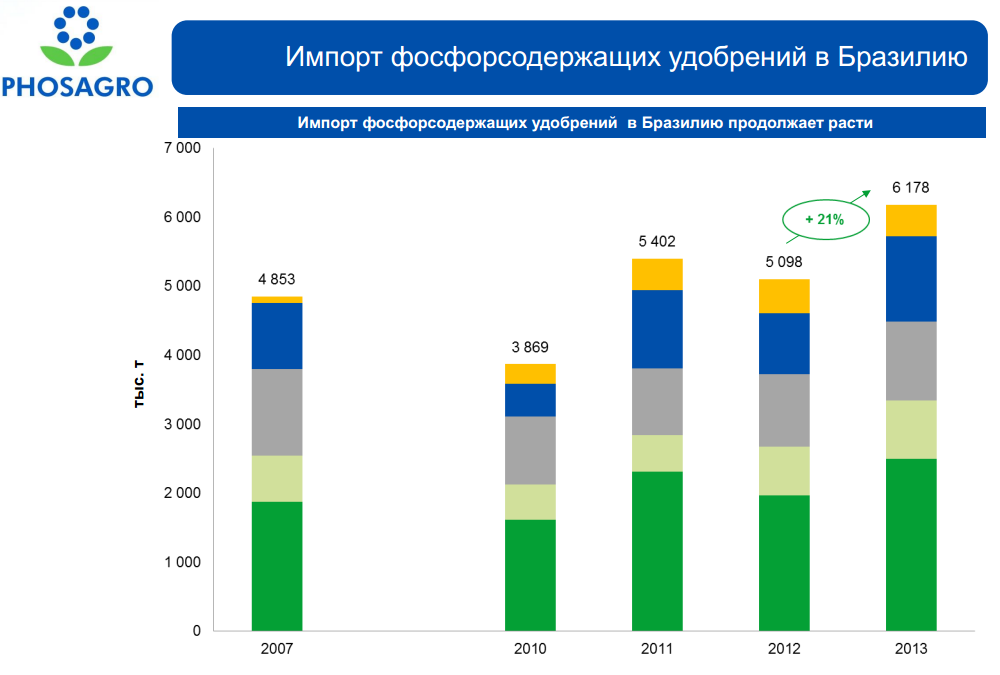 В презентации ФосАгро указало на благоприятную ситуацию развития потребления удобрений в Бразилии и неблагоприятную ситуацию из-за падения курса рупии в Индии. В 2013г. Индия импортировала всего 3.7 млн.т DAP. Однако ожидается восстановление поставок до 5 млн.т.
