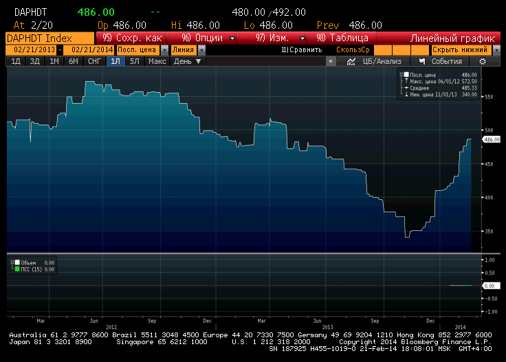 Основной причиной снижения показателей рентабельности EBITDA c 33% до 23% стало неблагополучная ситуация на рынках удобрения, которая усугубилась разрывом картельного соглашения Уралкалия и Беларуськалия в конце июля. Цена бенчмаркера фосфорных удобрений DAP упала с $455 (30.07.2014) до $375 в конце года. В середине ноября цена достигала $343. А зимой 2014 цена DAP взлетела до $486. Мощное восстановление цены обусловило сильное восстановление акции ФосАгро. В моем сентябрьском обзоре справедливая цена акции (1133р) рассчитывалась из цены DAP $450 в 2014г.