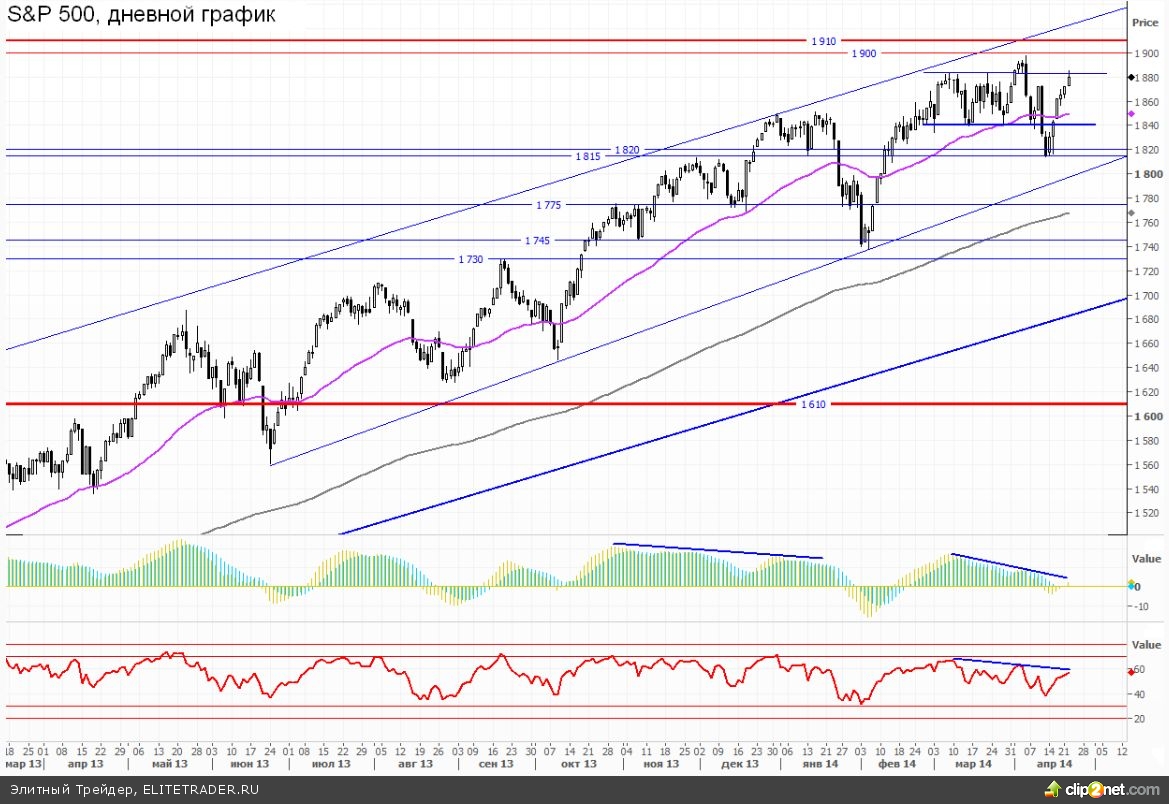 В свою очередь американский индекс широкого рынка SnP 500 показал уже шестую сессию роста подряд (российский рынок за это же время немного снизился). Вчера котировки вернулись в район 1880. До новых исторических максимумов остается около 1%. Если учесть фактор безальтернативности американского бычьего тренда в последние годы, то вероятность обновить экстремум и прыгнуть выше 1900 сейчас очень высокая. Сценарий с массовыми распродажами за океаном пока снова отходит на второй план. Недавняя коррекция с максимумов составила всего чуть более 4%.